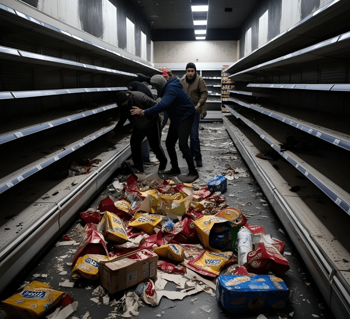 En quelques heures, l’approvisionnement alimentaire est perturbé. Les supermarchés sont vidés dans la panique. Des scènes de pillage et de violence éclatent, non seulement dans les zones urbaines, mais aussi chez les producteurs locaux, attaqués par des habitants désespérés.