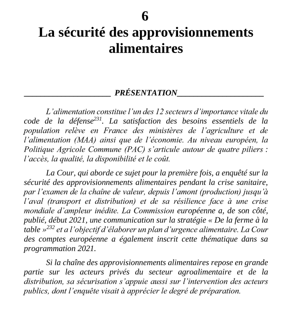 Déjà en 2019, une proposition de résolution déposée au Sénat le 20 juin, intitulée « Résilience alimentaire des territoires et sécurité nationale »*, alertait sur les risques liés à notre dépendance alimentaire et à la vulnérabilité des territoires en cas de crise majeure. Ce texte anticipait ce que le rapport de la Cour des comptes en 2022 allait confirmer : la France est loin d’être prête à affronter un choc durable.